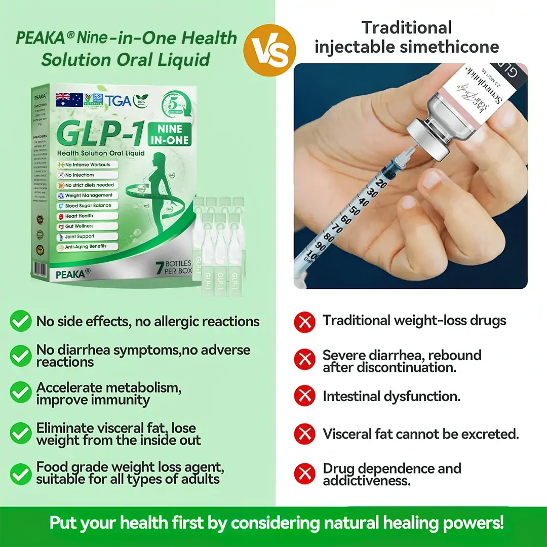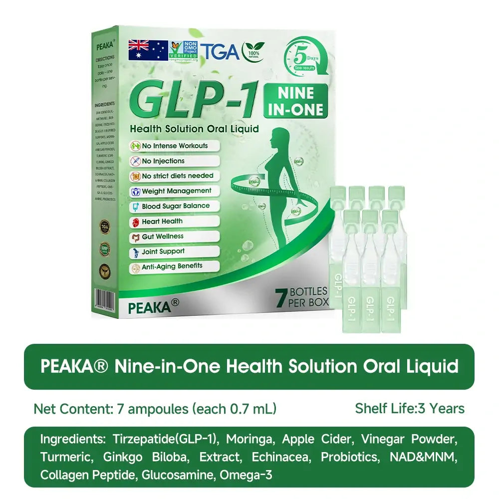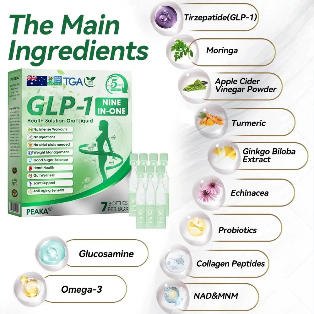 GLP-1 NINE-IN-ONE Health Solution Oral Liquid was developed by a team of over 30 leading experts in endocrinology and metabolic health after more than three years of research. Formulated with Tirzepatide and potent plant-based ingredients. it works to naturally boost metabolism. accelerate fat burning. and support digestive and lymphatic health. This oral solution meets stringent Australian safety and efficacy standards and is backed by international research. offering a reliable and science-based approach to healthy weight loss and overall wellbeing.